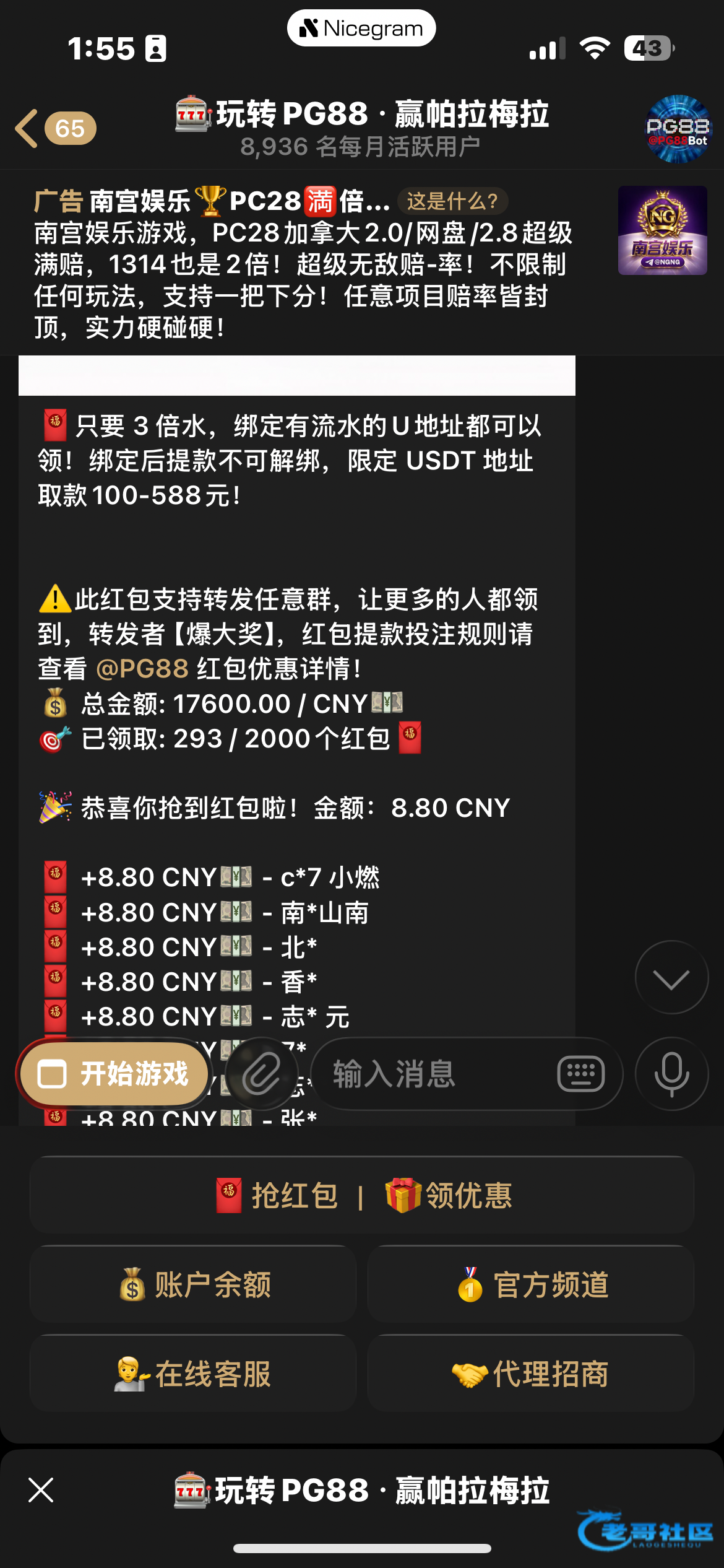 @pg88 机器人 进去进群领取红包 有流水地址就行 还有1700个包