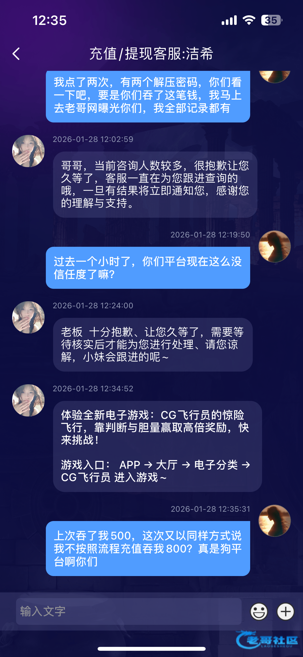 第二次被吞了,支付宝充值的,都是按照流程充值,转账之后发邮箱,然后点确认,然后不到账,去问客服就是说没有按照流程操作,然后就一直拖延你时间,然后就说订单超时了,我草,狗平台,