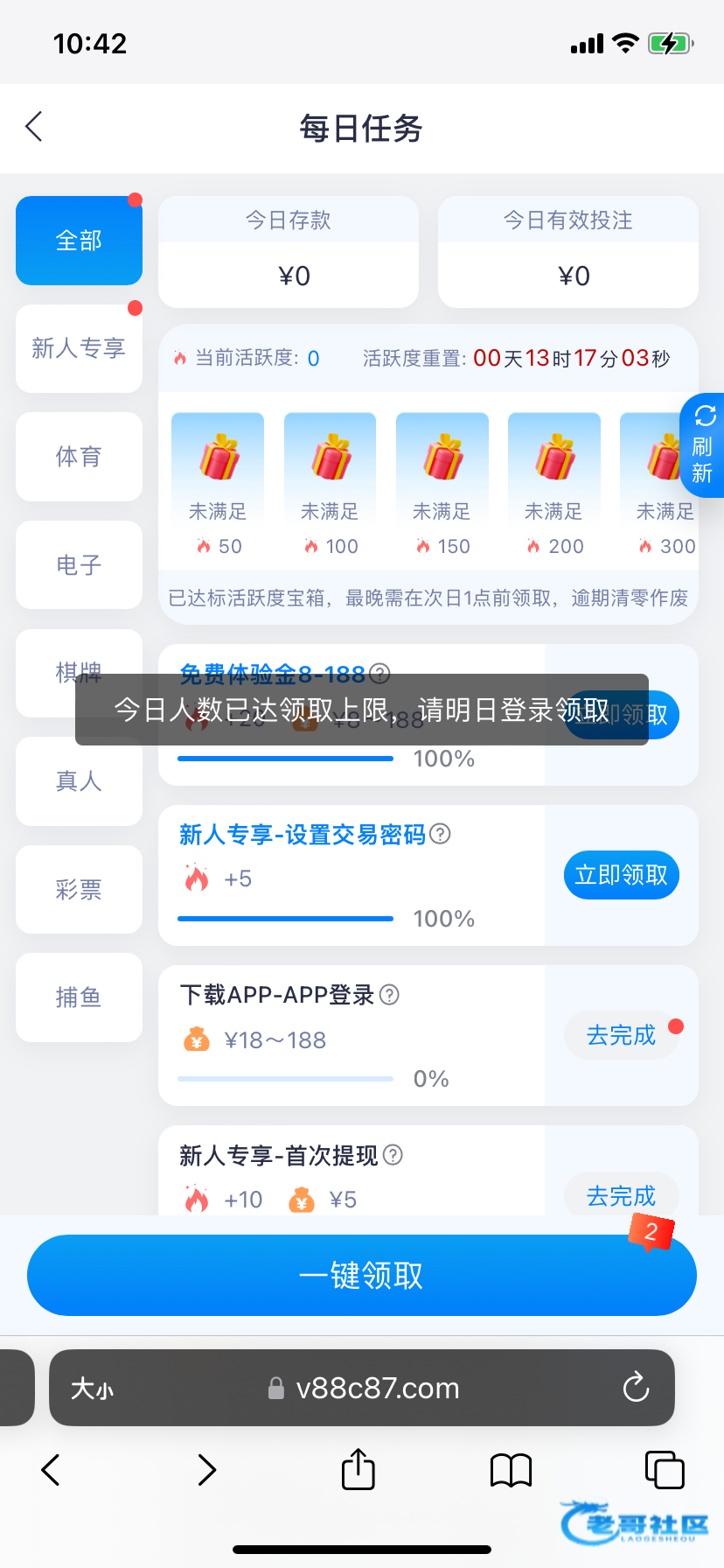 领取不了 显示今天上线