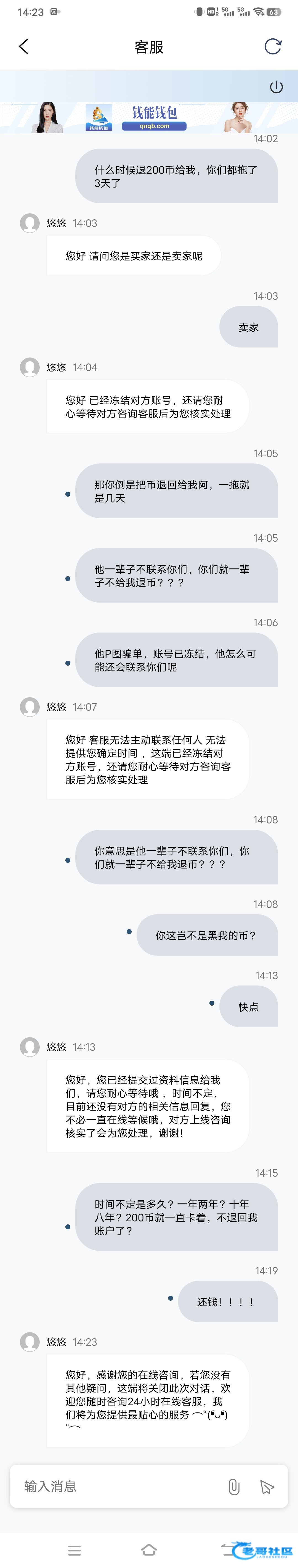 碰到一个傻b钱能买家,加了我微信后不转钱给我就发张假支付截图,然后上传至钱能订单催我打币,笑死了!钱能客服核实后冻结他账号但是仍然卡着我的币一直不退回给我,气死我了!这200币许是被钱能黑了,有个钱能客服甚至还戏谑我“你服了没有?”。md!