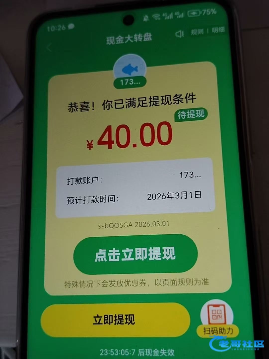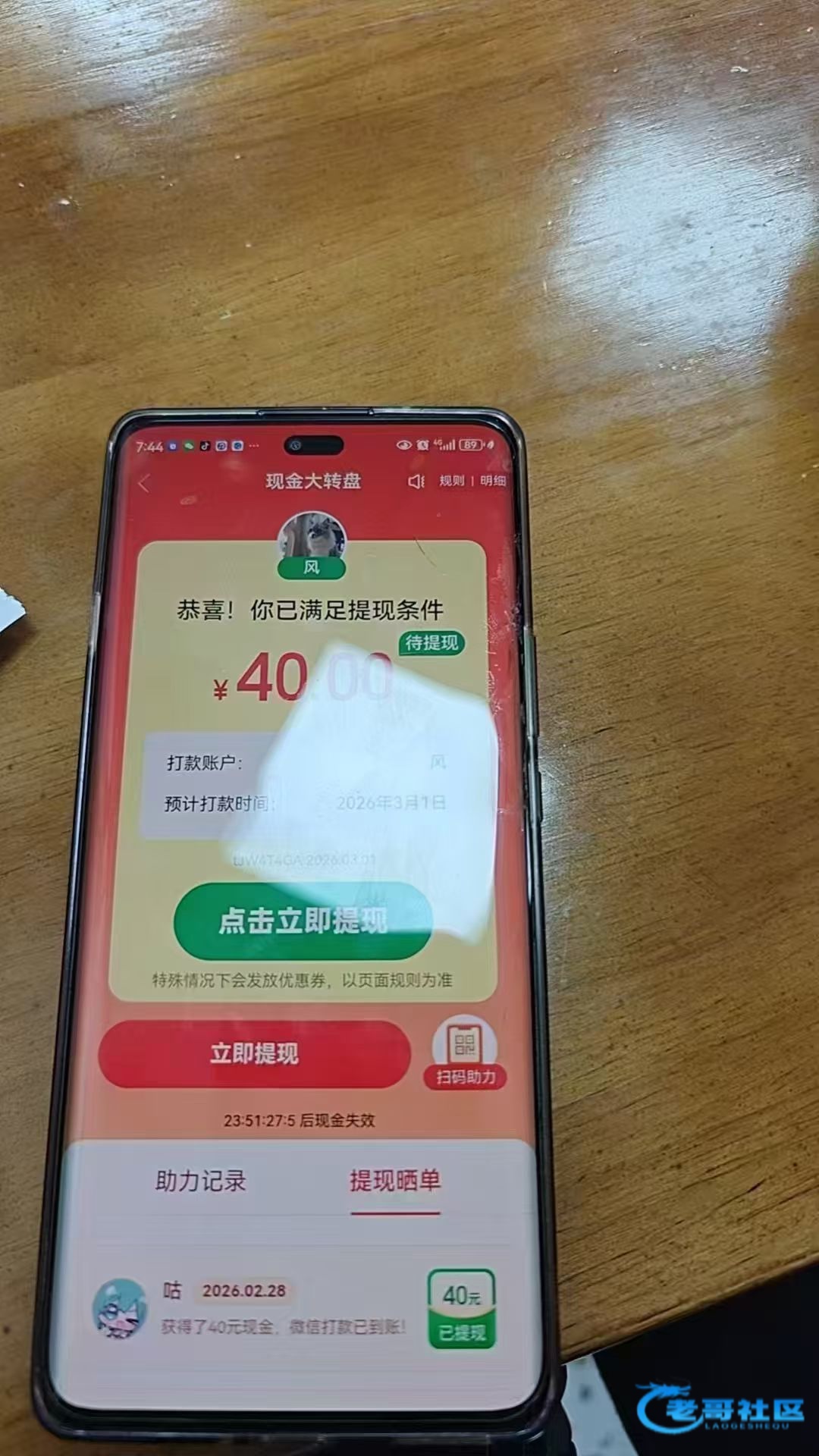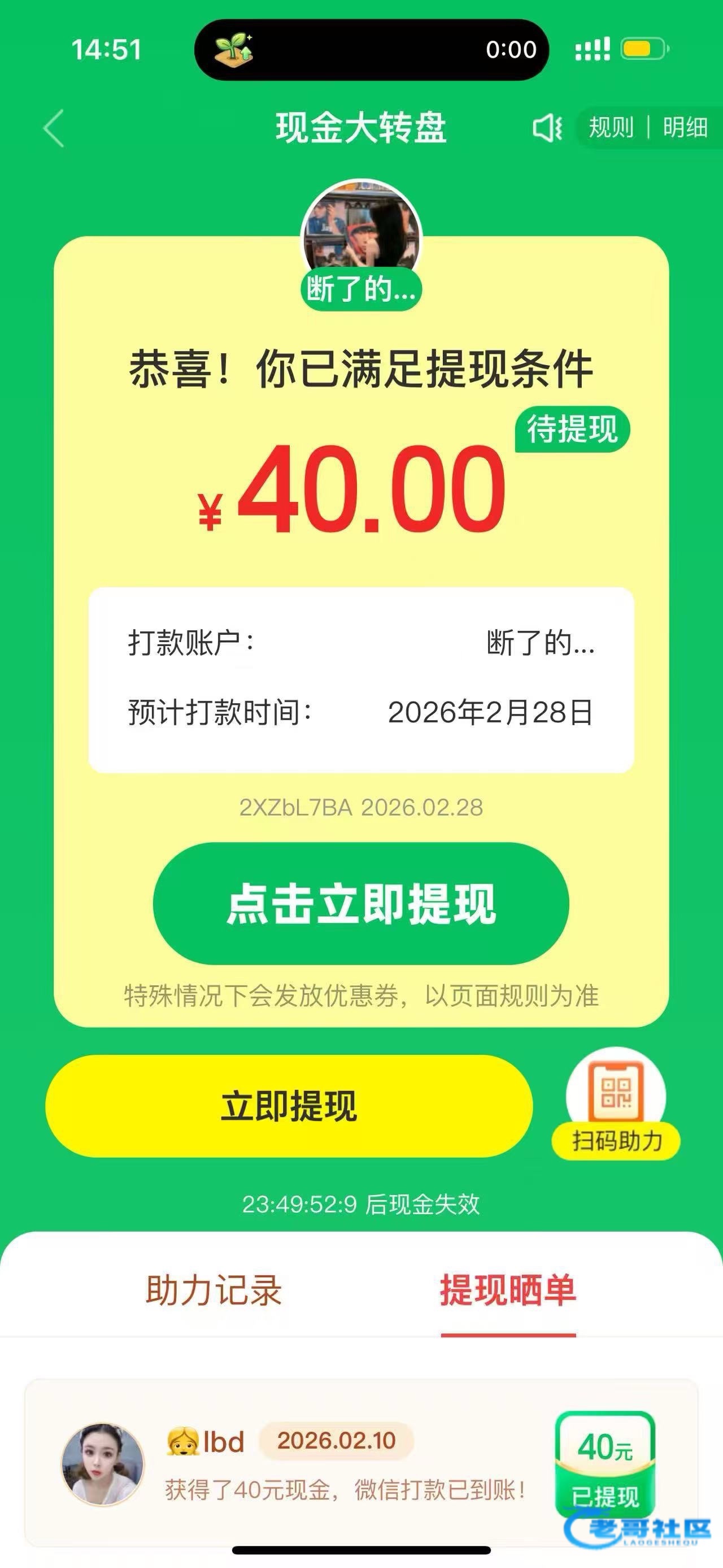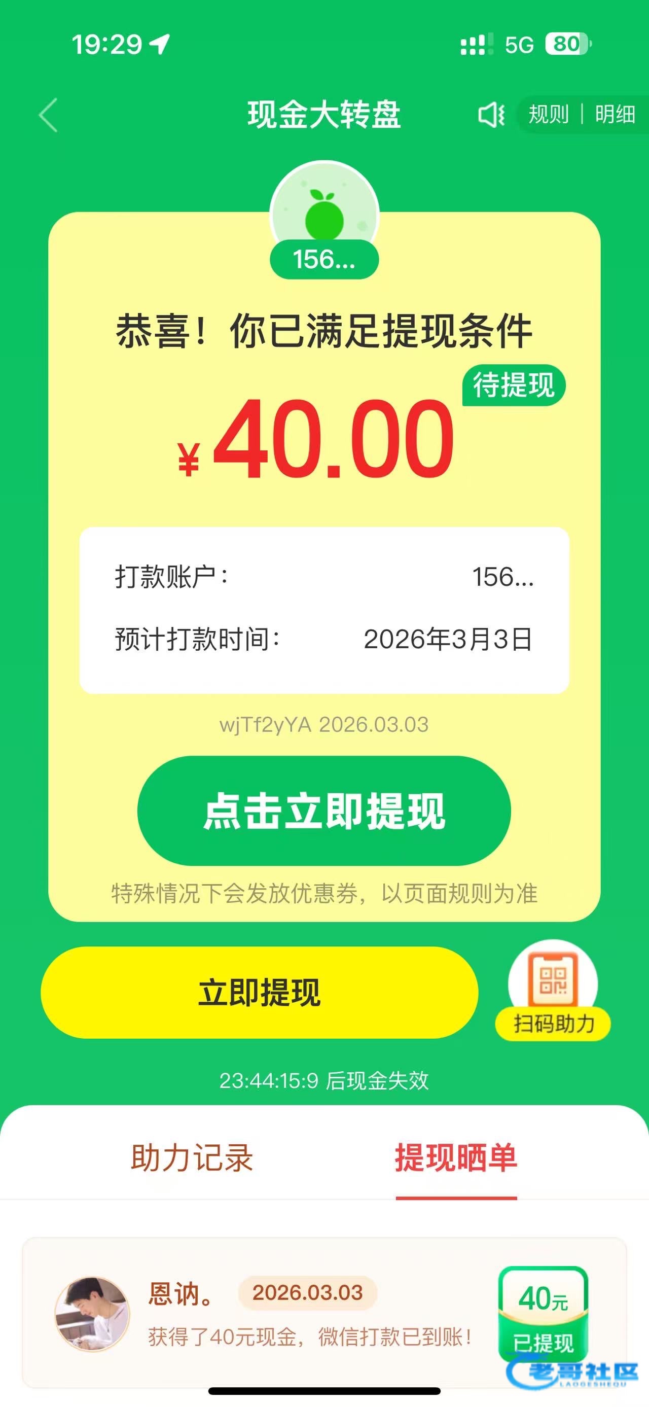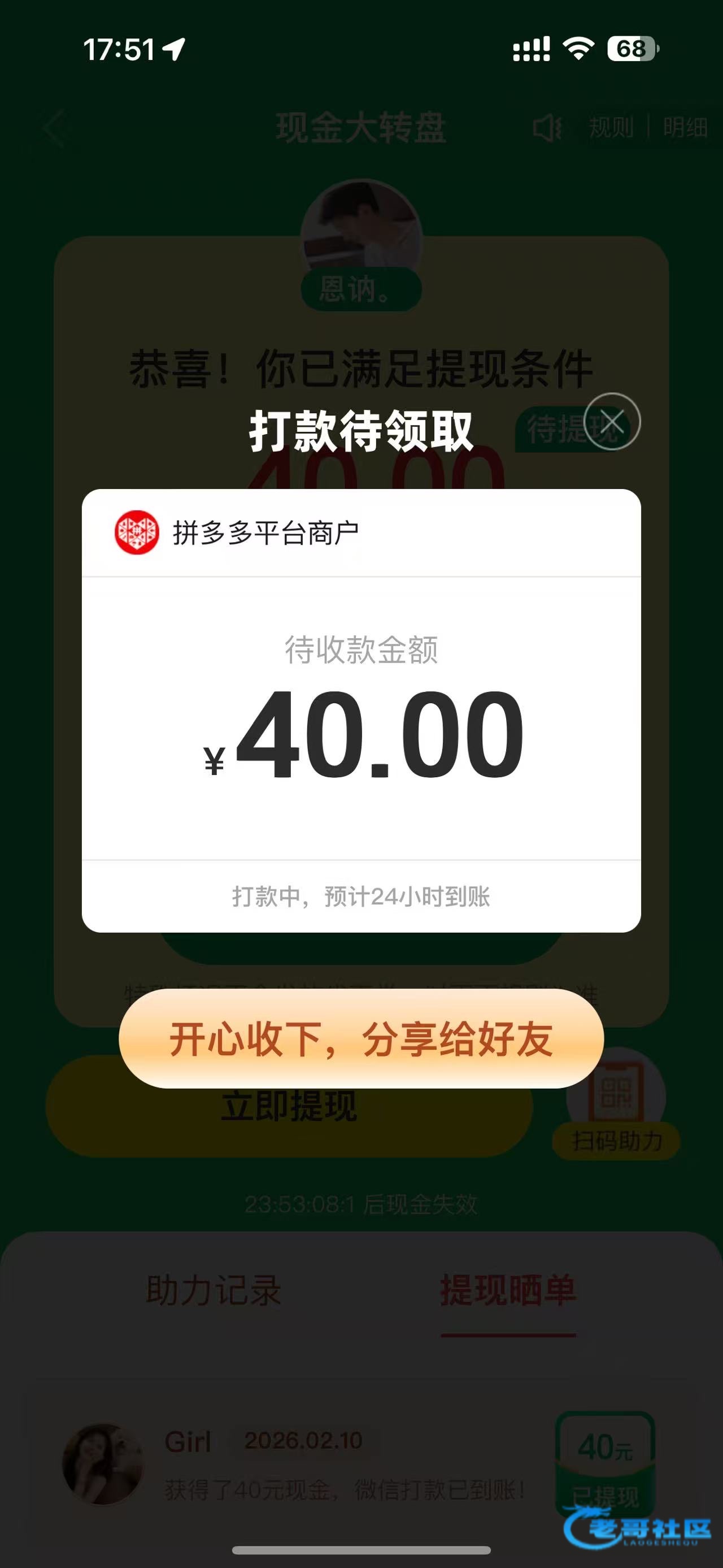 目前是人在浙江陕西的朋友们拼多多大转盘40元玩法是:进去拼多多大转盘点了开就关掉拼多多后台,第二次进入拼多多大转盘点进去二维码自己保存好再次关掉后台邀请6个好友之后抽几下就会到账。注意点了抽一定要退后台,不然系统自动抽一下就不行了。正确的是3次抽奖,好友助力完打开抽就可以今天我到账太多了一个号可以做两轮