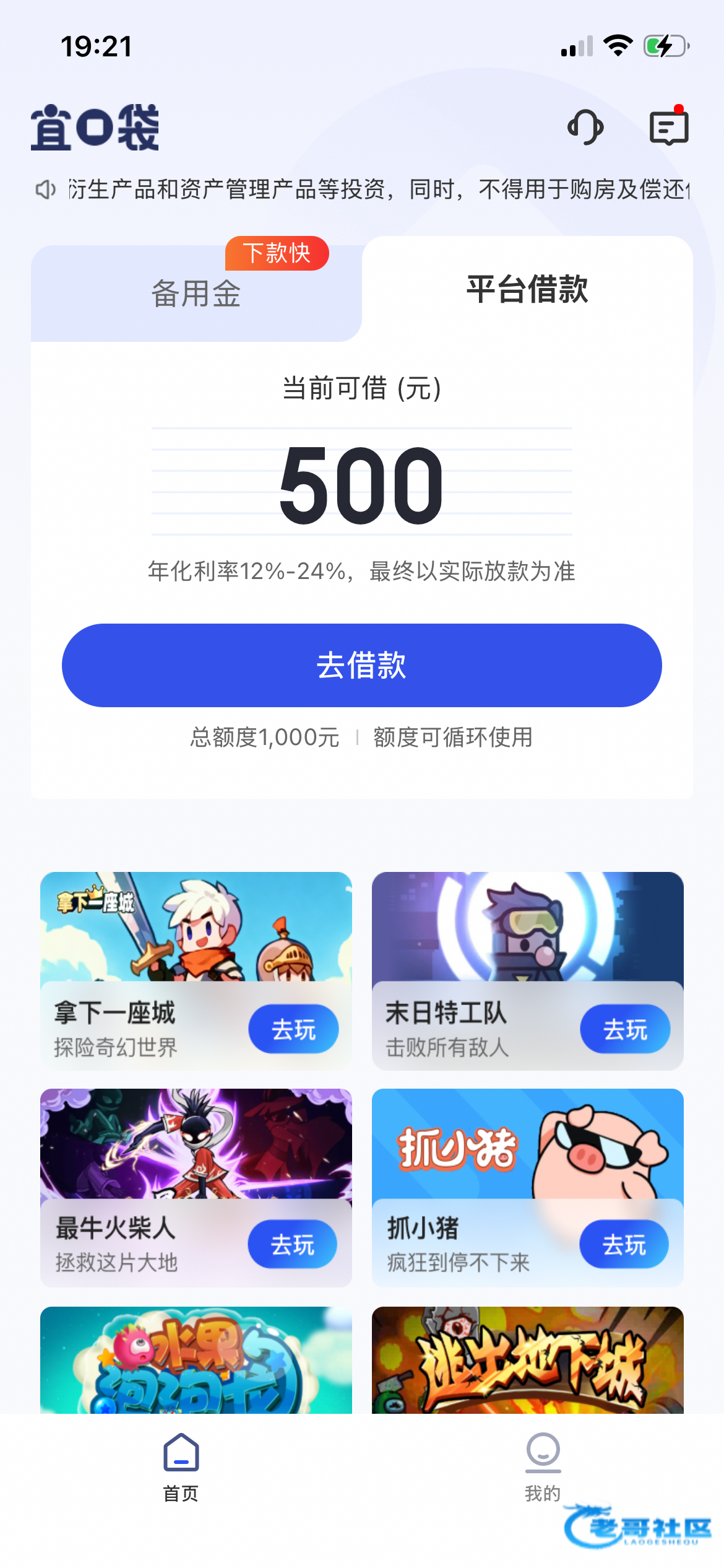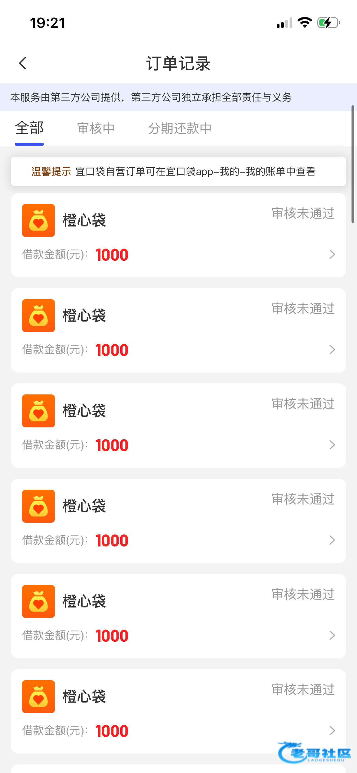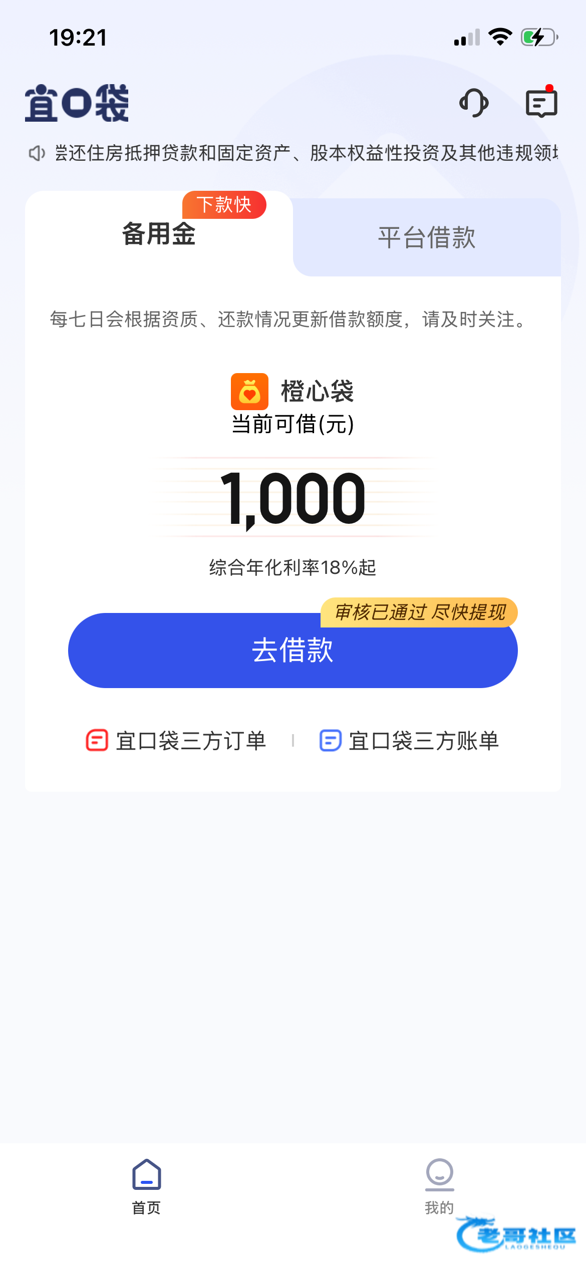 橙心袋有一千额度,就是审核不过,宜口袋下了个500,还有500也不过。