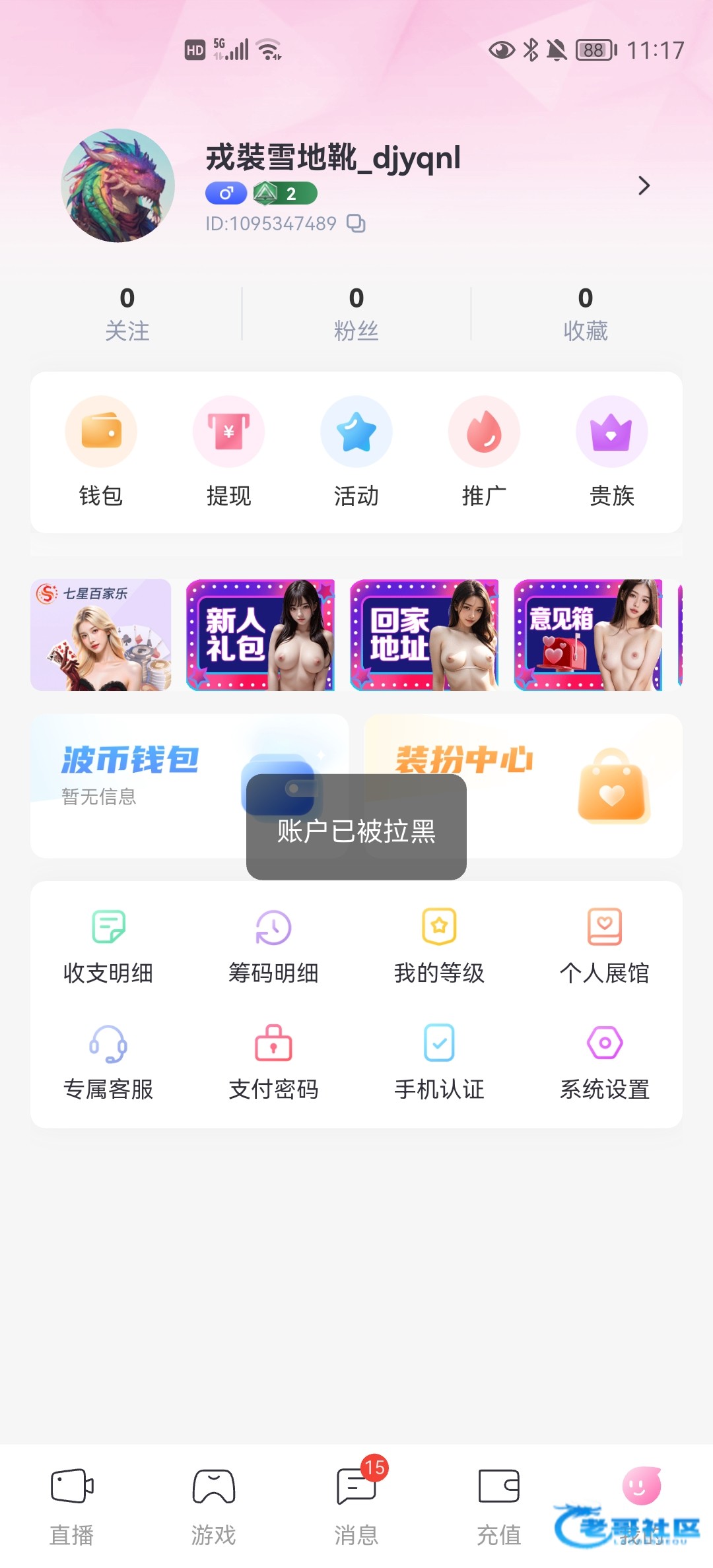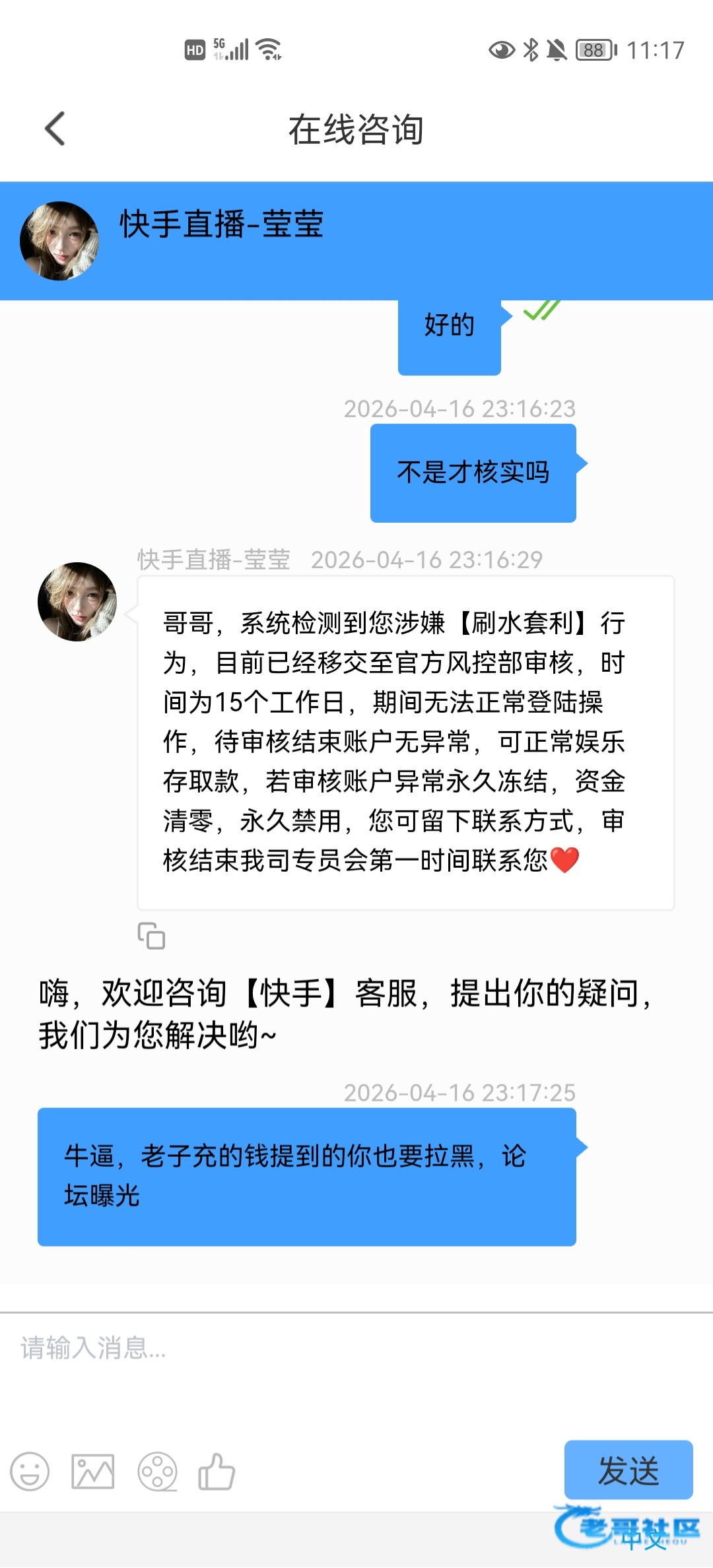 我接到电话送了28输了我又充50也输了,后面又充100输了。领了奉旨发财二存包赔,打百家乐打到500又输回400,提400,没通过。后面找客服搞半天上传手持,又提直接拉黑踏马的大黑笔。充了的都提不了,艹踏马的400都给不起的黑台。大家避雷