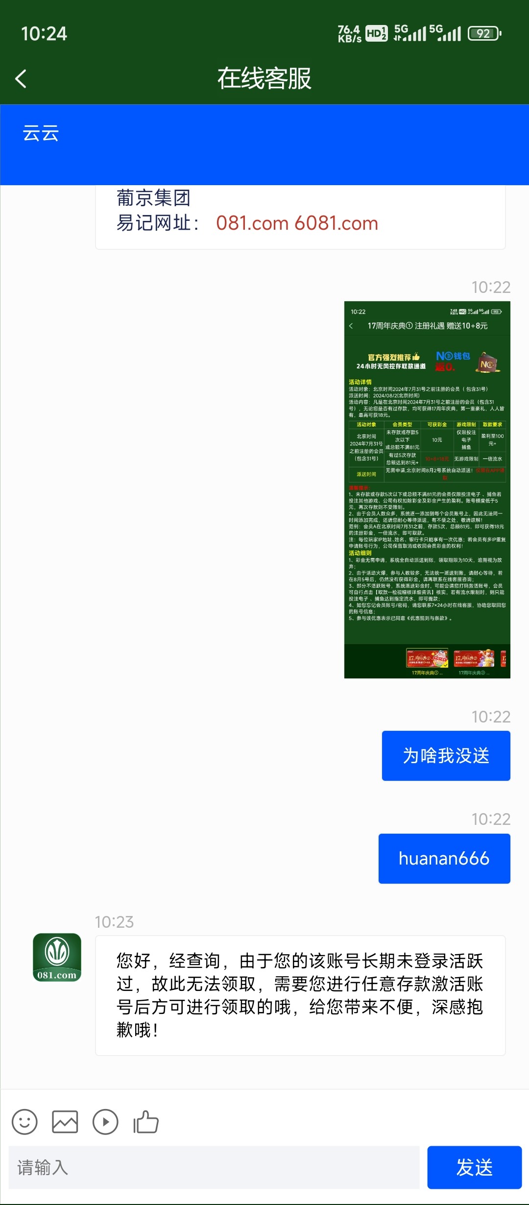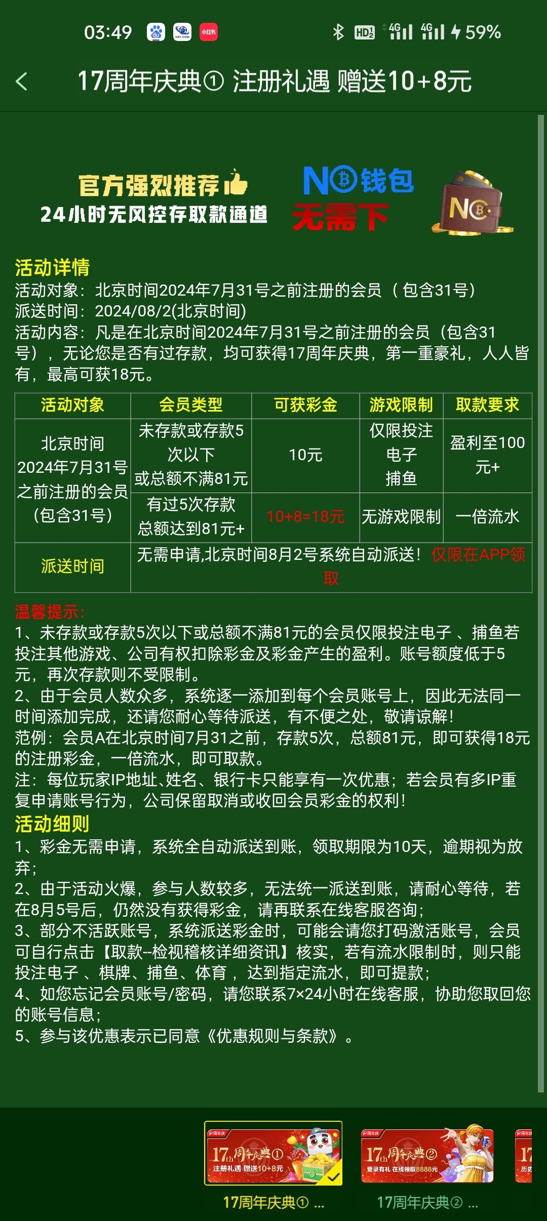 7月31号之前(包含31号)注册的没存款也能领10,8月2号派送,没注册的可以囤一点号,新用户注册下载APP还能领18
