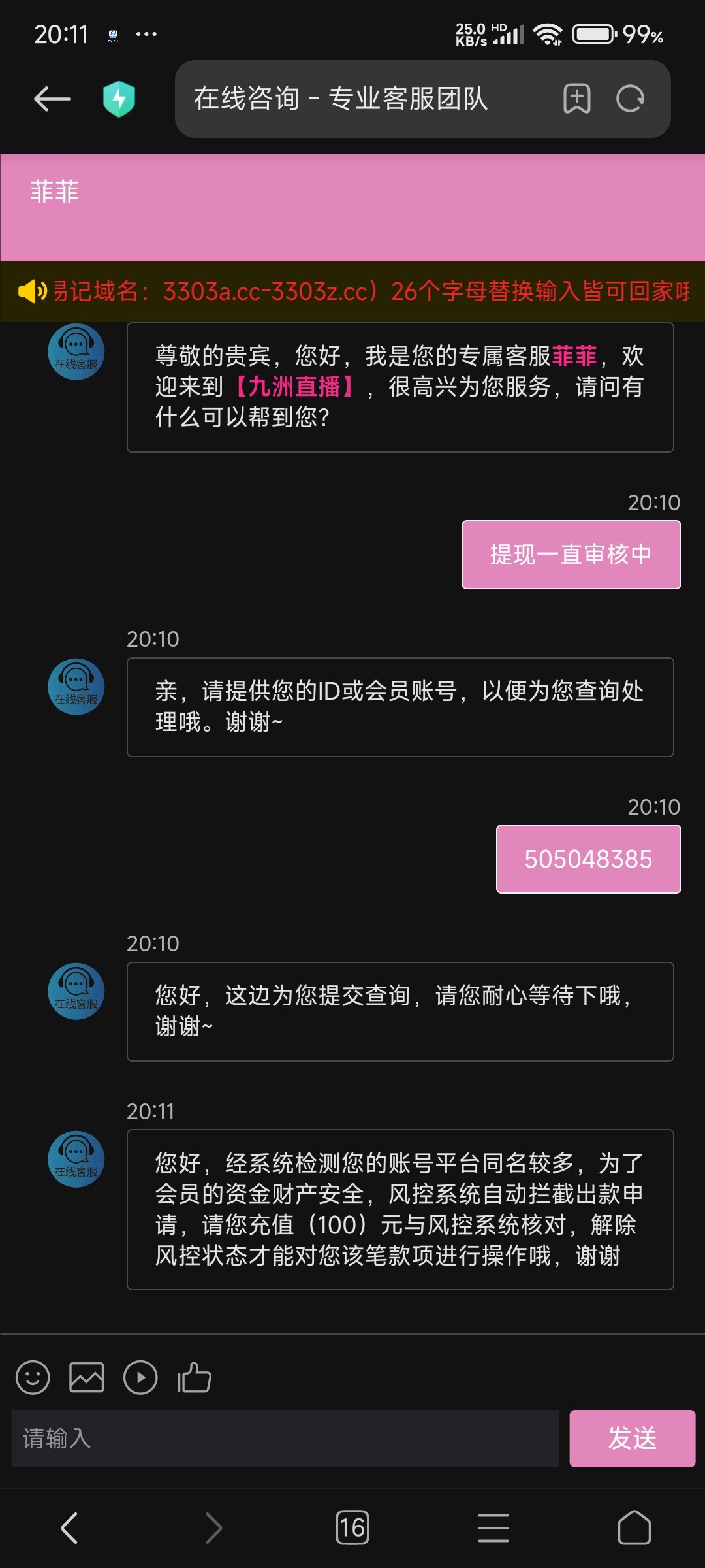 Skype ▶ bnnj 黑笔来的,我之前嗨秀直播打电话送8元 打到200快不到,狗比在线也是这样回复我,流水要打800多提现,我充值了100 充100解除 流水没打到一半挂逼了,提现那里还显示有流水 2024-10-26