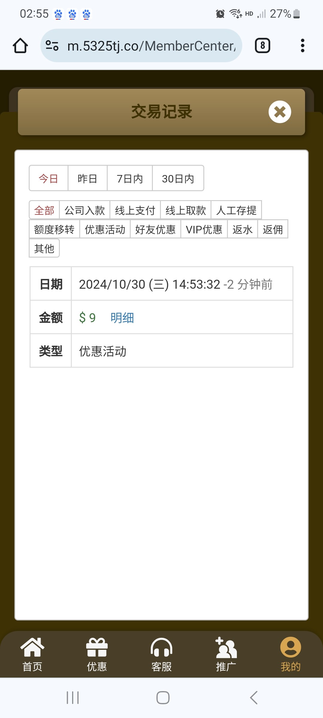 收到短信找在线客服领了9块 没打出来 网站 www.966312.co