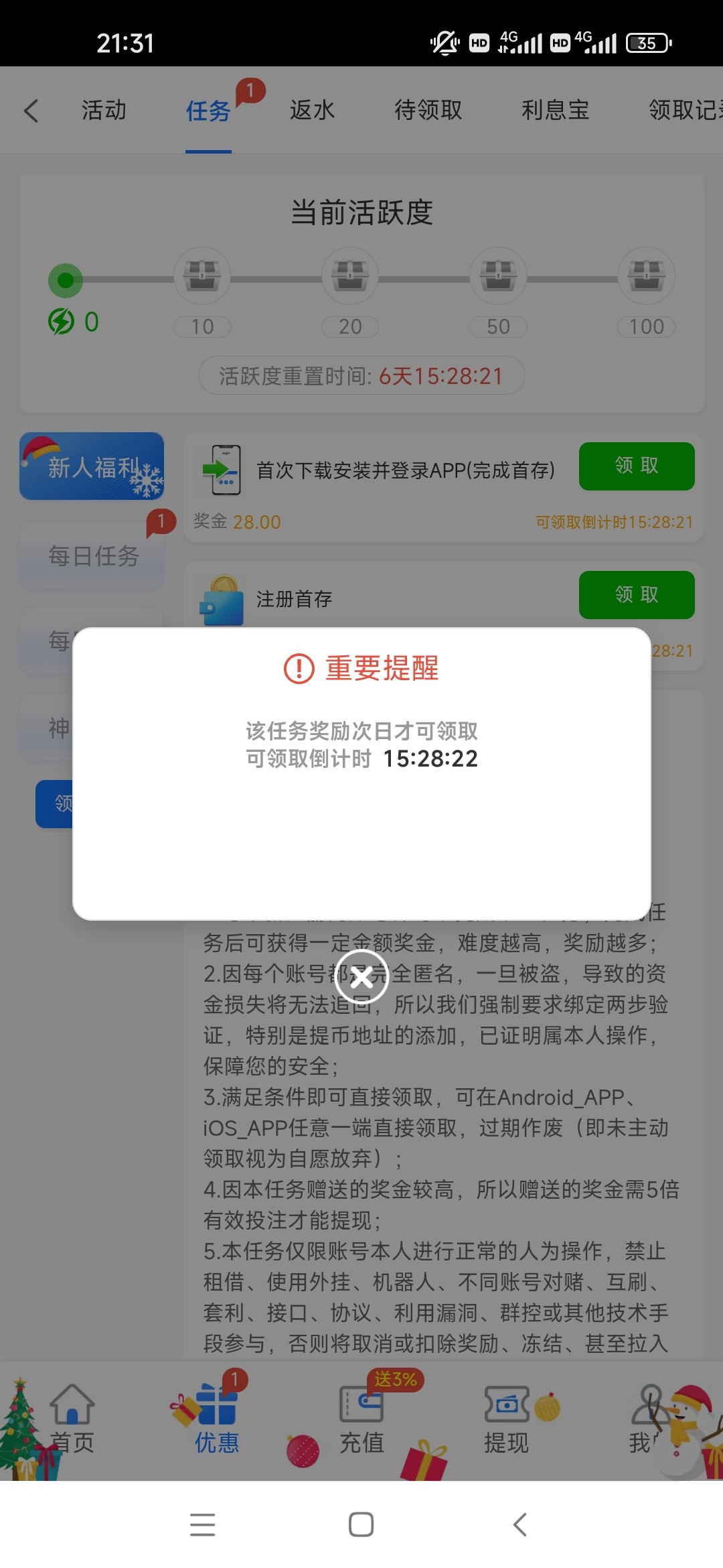 6686数字台,本人8级,每个月3888红利,1号领了3888,想着打出来,结果输急眼了,充了24000,结果全部送了,结局都一样,红利就是为了让你再次入局。哎,痛苦