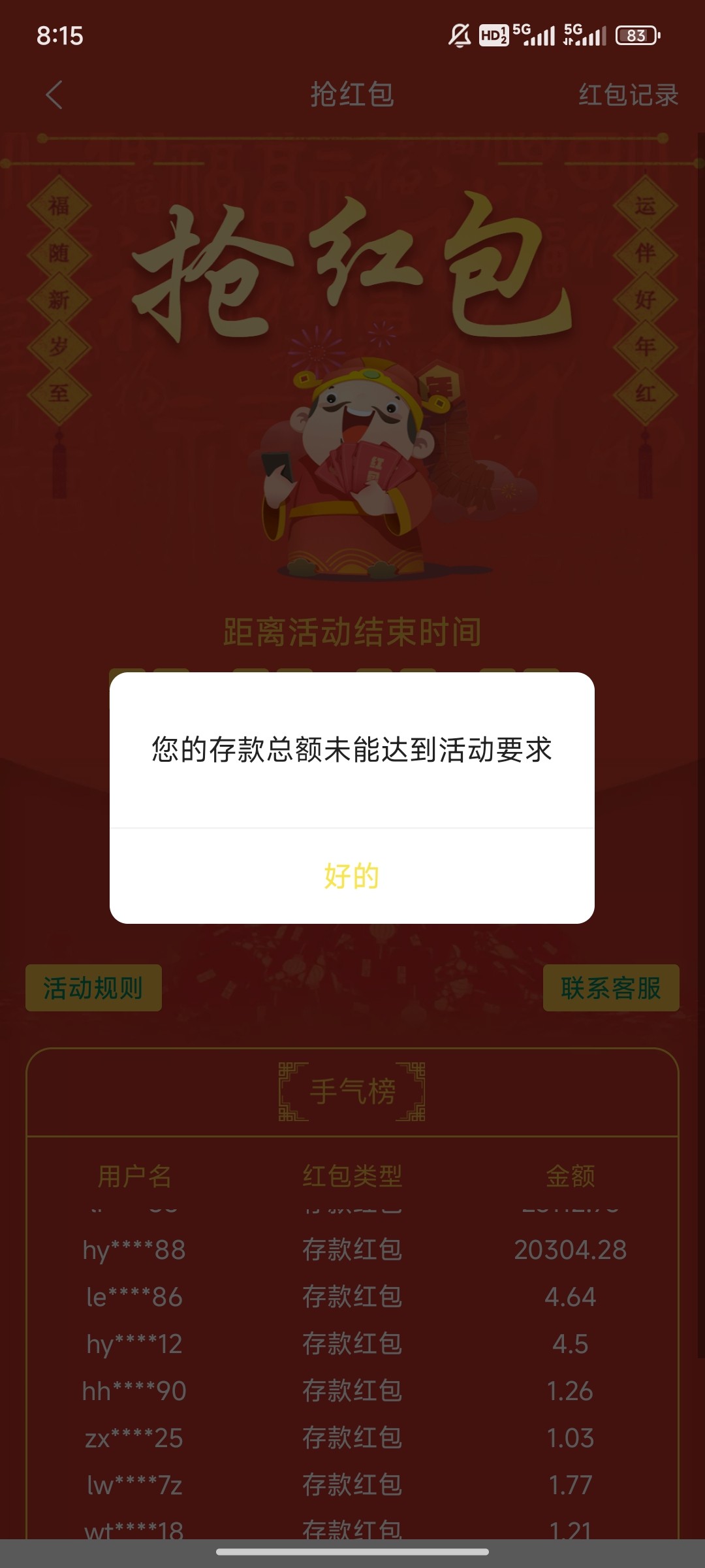 现在这个红八点包要前一天存款两百以上。