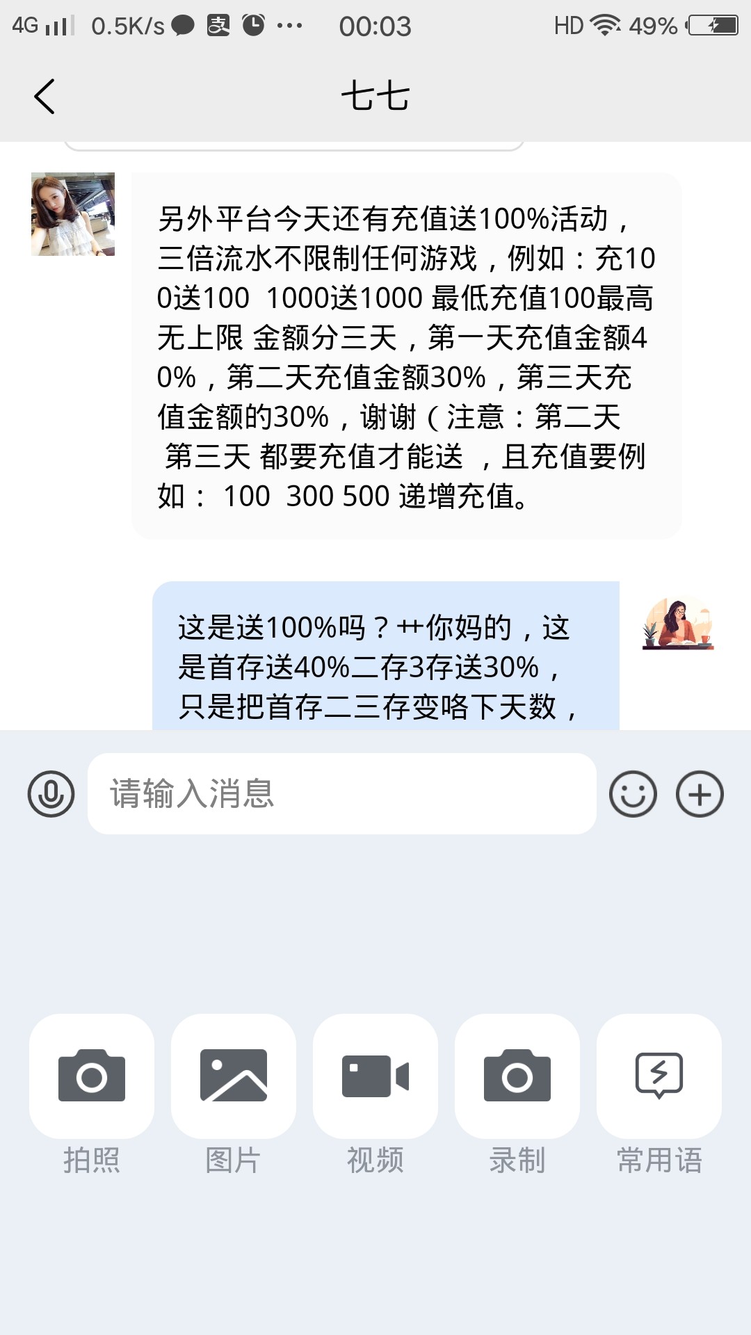 老哥你看时间第一次充值根本不说二三天要充值才送,明显玩文字游戏骗人的。有押金的话直接扣了他们,妈的气死我了