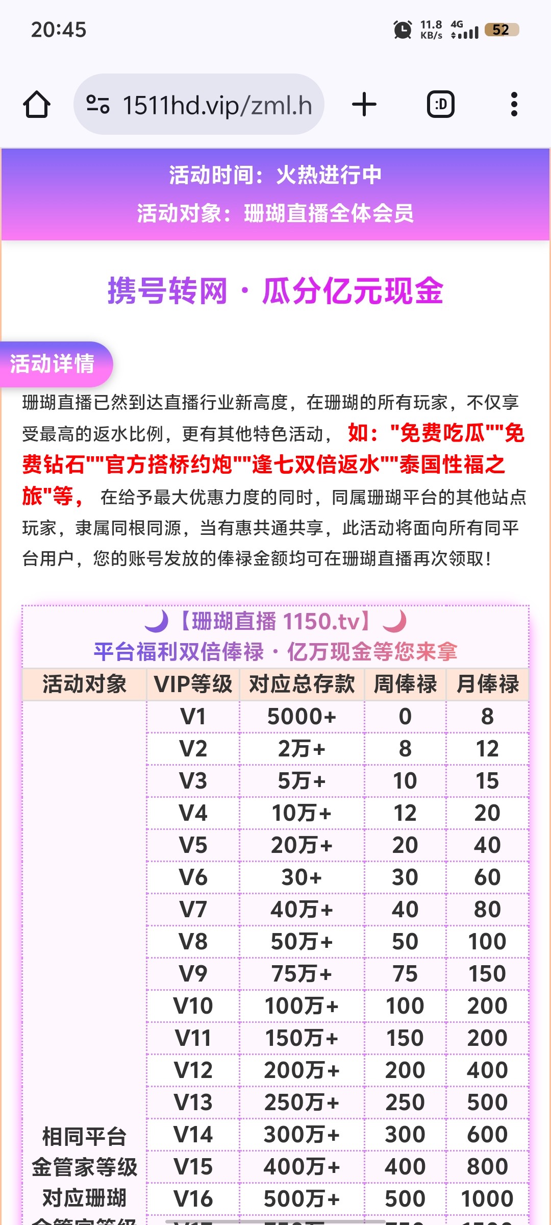 4。金管家双倍俸禄,活动里自己看,有其他黄台的联系客服申请相当于平移vip,其他黄台有等级的每个月可以领一次,你原来黄台一个月周俸禄+月俸禄彩金的总和,每个月1号联系客服领取,申请当天也可以领一次,例如你有其他黄台月俸12周俸8,每个月一号你就可以联系珊瑚客服领取8×4+12具体活动里看