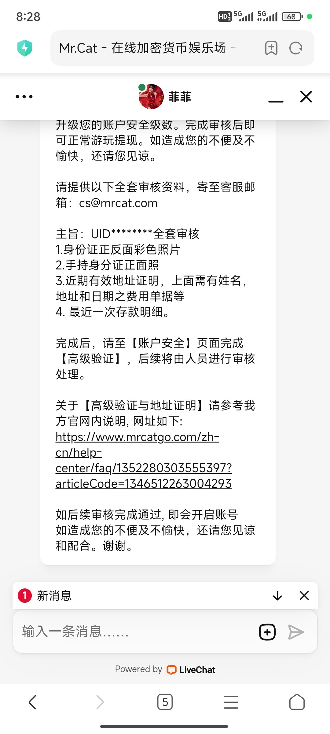 信我,猫先生改版后就是半黑台了,18年注册冲几十万的号,提交了一大堆资料封号。别想了