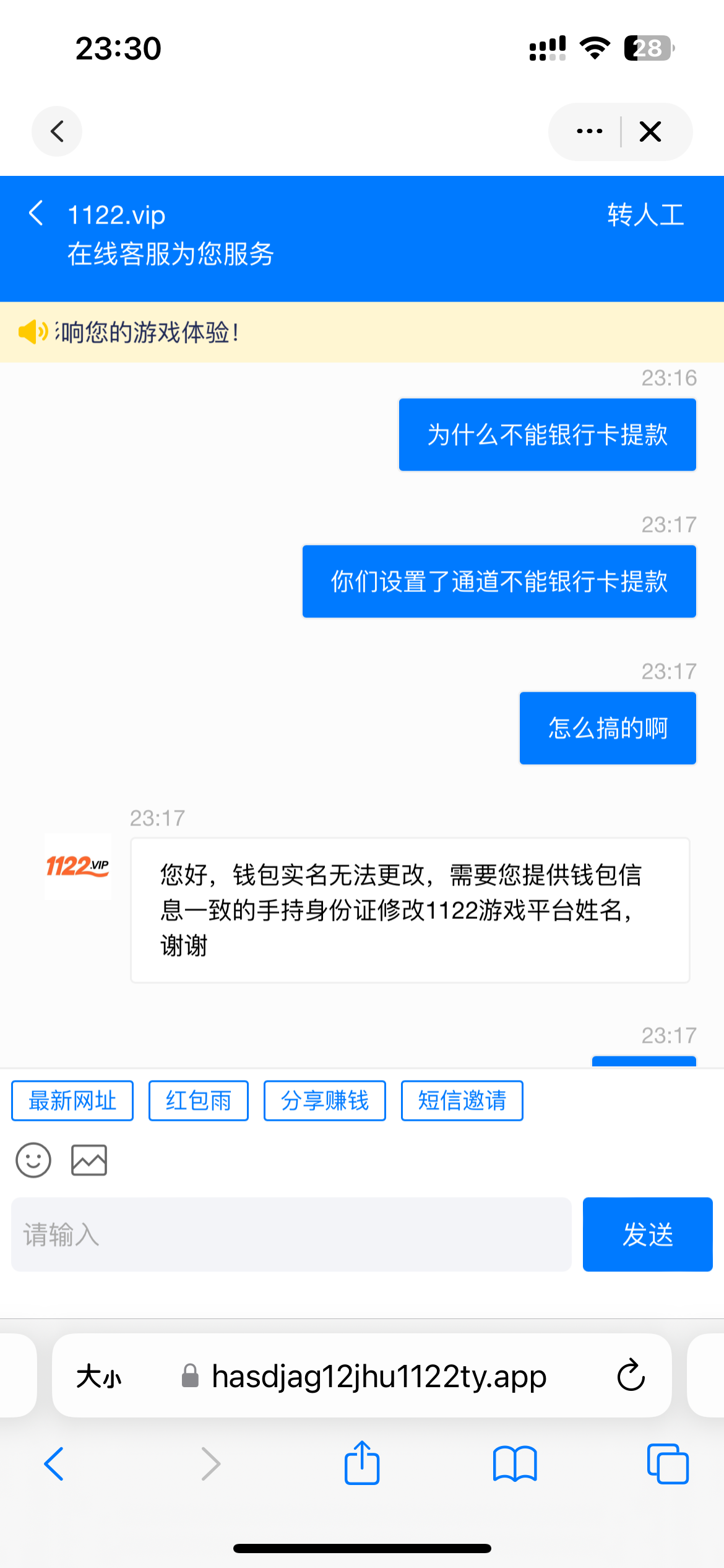 这个傻逼台 人民币充值只让提他们的24钱包 银行卡别的电子钱包都不行 我的24钱包注册过了 她说不是在他们平台注册的 下午让亲戚注册说可以 现在去了又说实名不一样 傻逼杂种台 不是u充值的别想出银行卡和钱包 只能他们的24傻逼钱包 1122这个台 避雷吧