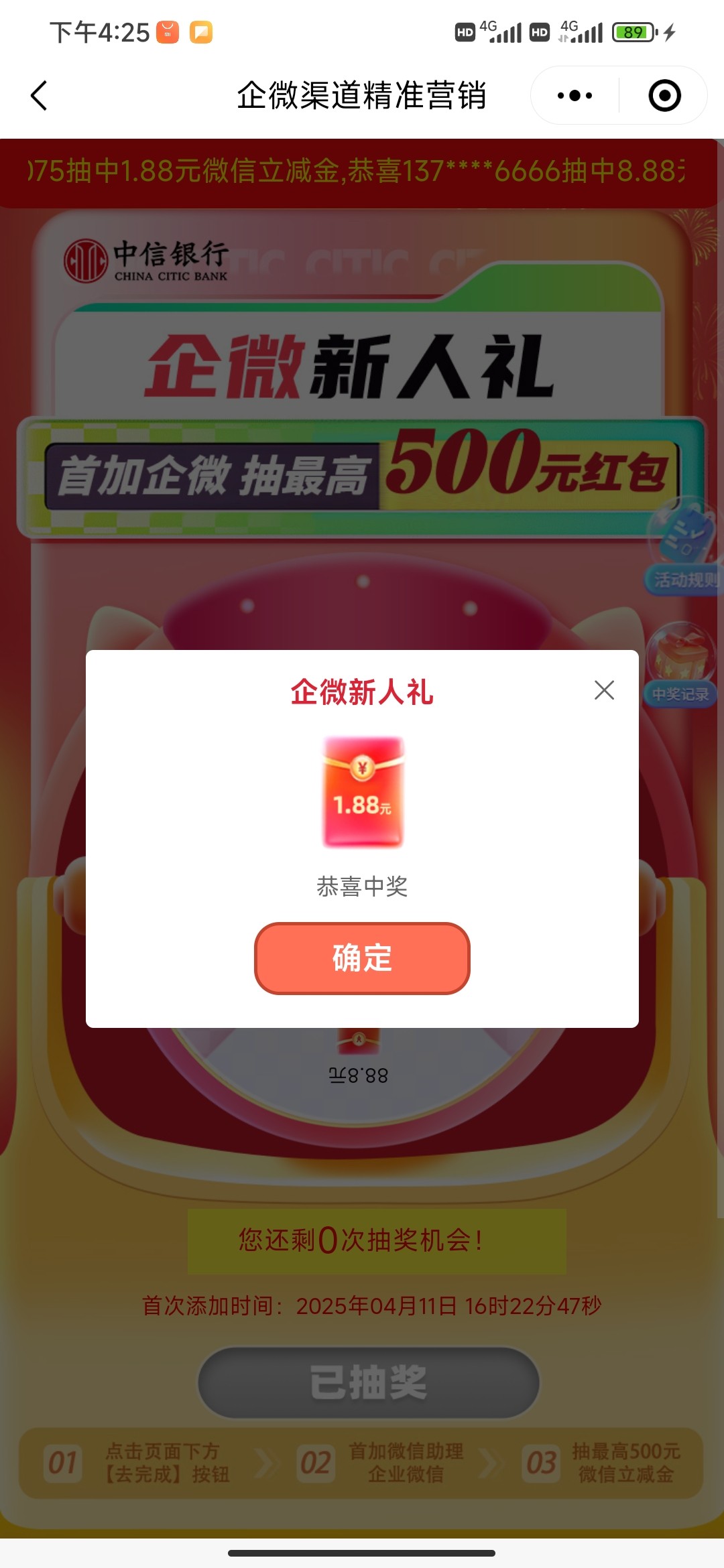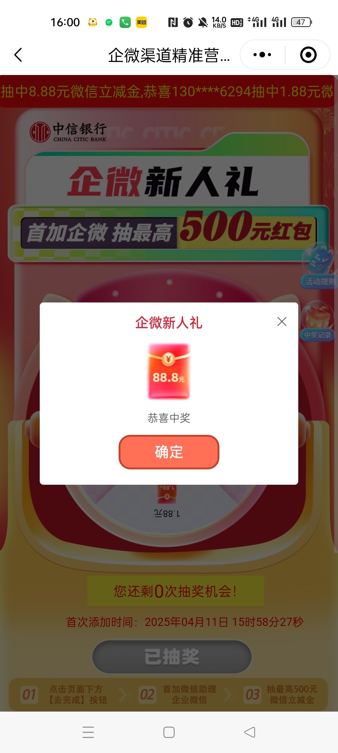 按步骤添加客服会给你发抽奖链接,多v多抽。密码红包小程序套出来,好多老哥抽到88.88,抽中没卡的在小程序开张电子卡就行了