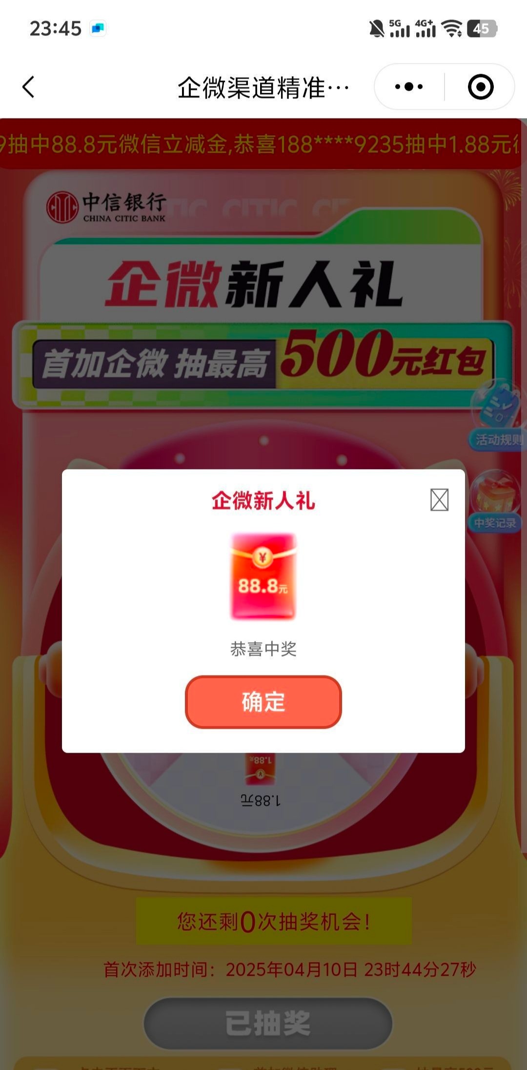 中奖率可以,4个号中了1个88,没卡的下中信app开三类卡,几分钟就好了