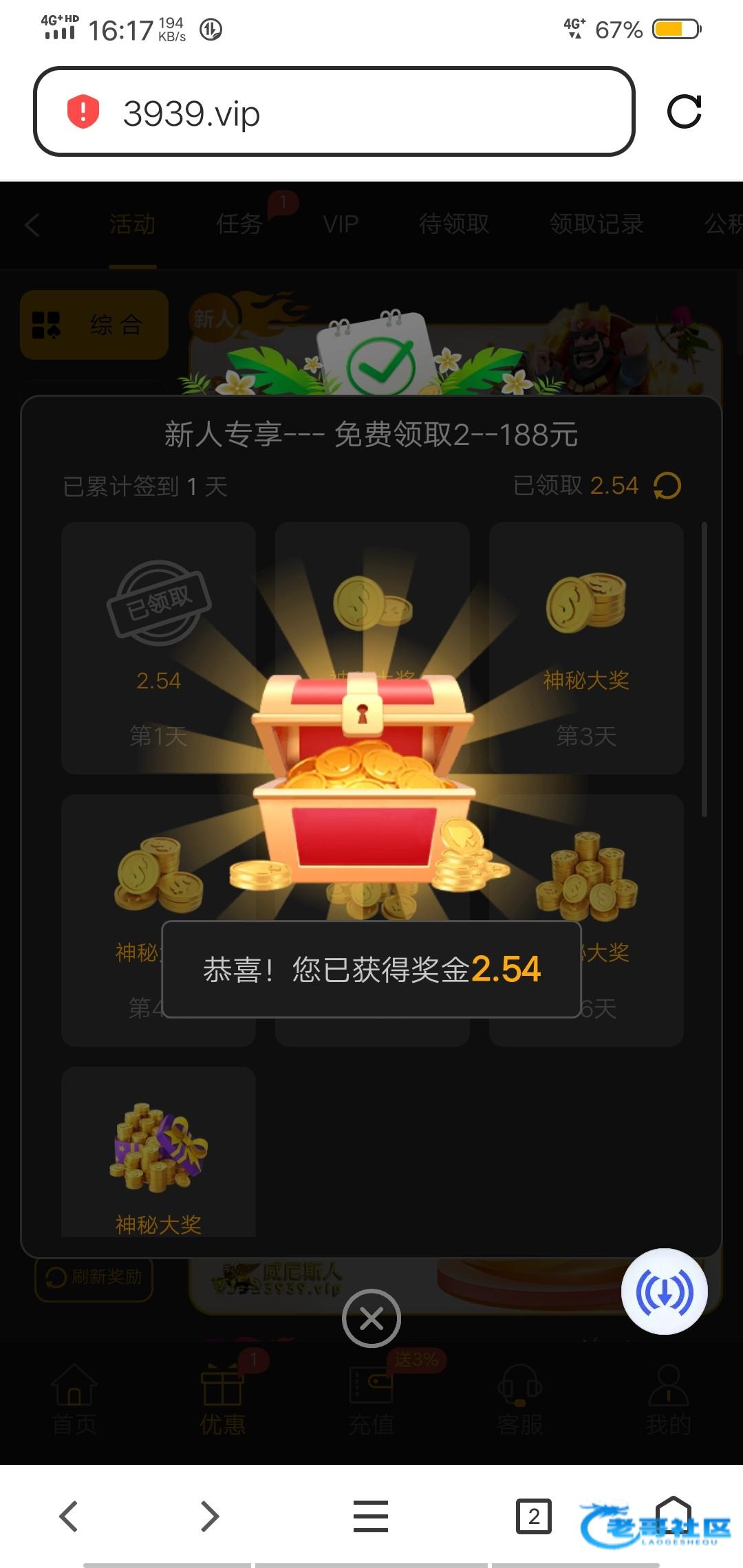 绑定银行卡就可以签到,可惜我绑了虚拟币,没充值不可以绑定第2个账户