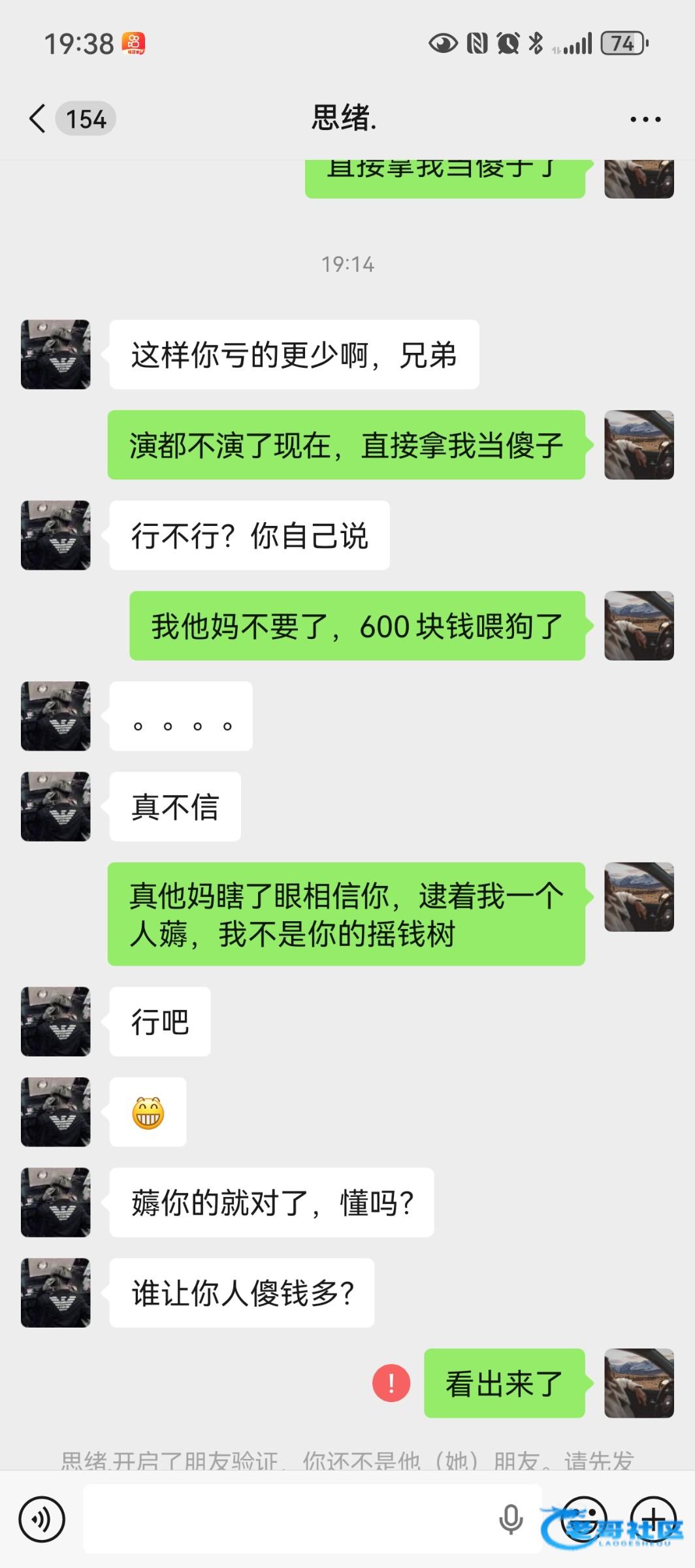 事情是这样的,昨晚在旺旺群里打加拿大里面有个人和我聊的很投机,我当时也赢了一些钱就和他互换了wx,在微信上聊天他跟我说没钱吃饭,我问他有没有打过星耀国际的台子,我给他钱让他充钱帮我打个人头,输了算我的赢了你拿去吃饭,我先转给他300输没了,又给他发了300他直接把我拉黑跑路了,转头还恶心我一顿。给我气的脑门子直冒汗,找狗庄把被骗的600块报销一下结果赢的钱也输没了,求老哥们帮我报仇,追回钱财一分不要全部给老哥们团饭,咽不下这口气,跪谢