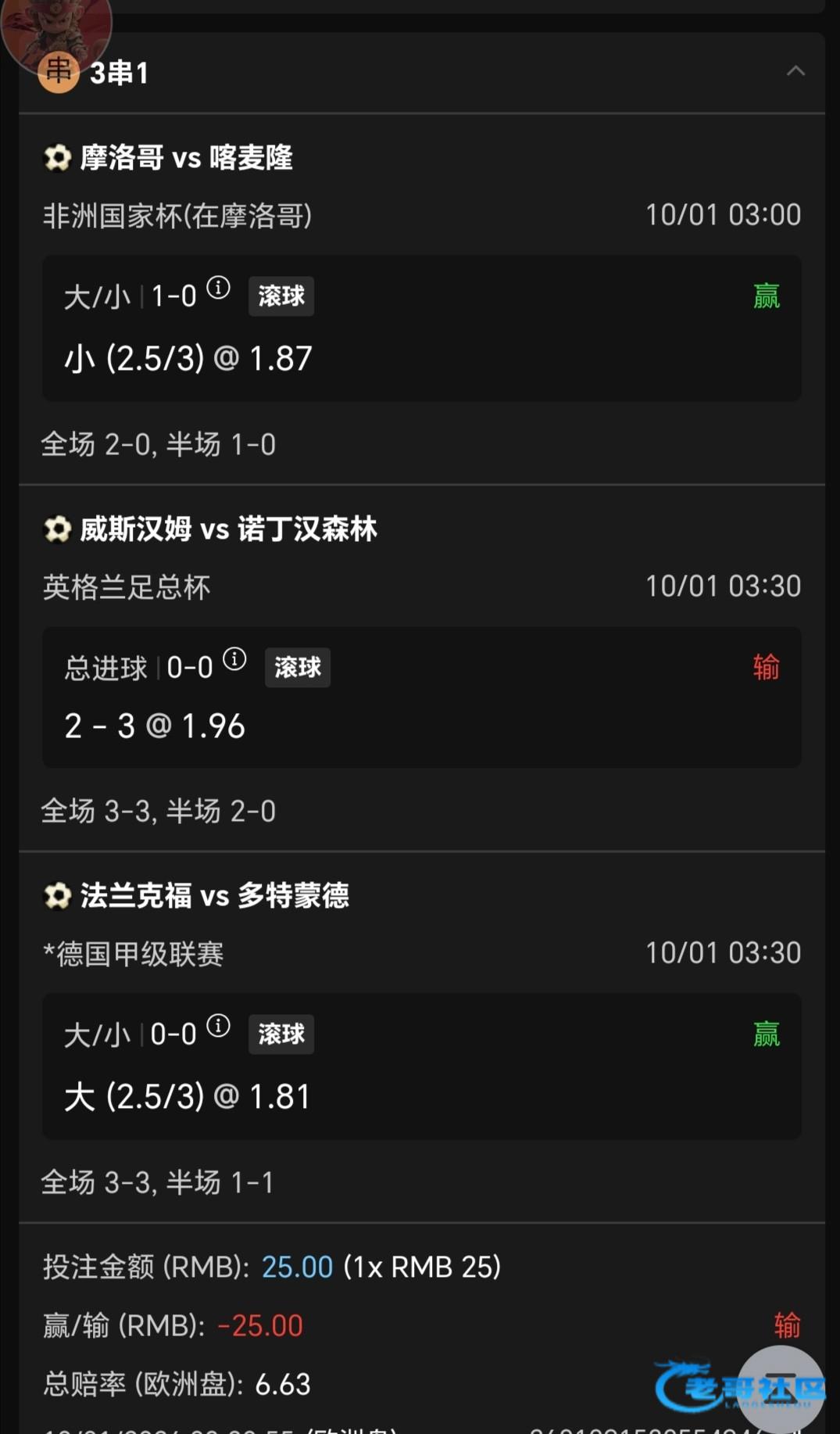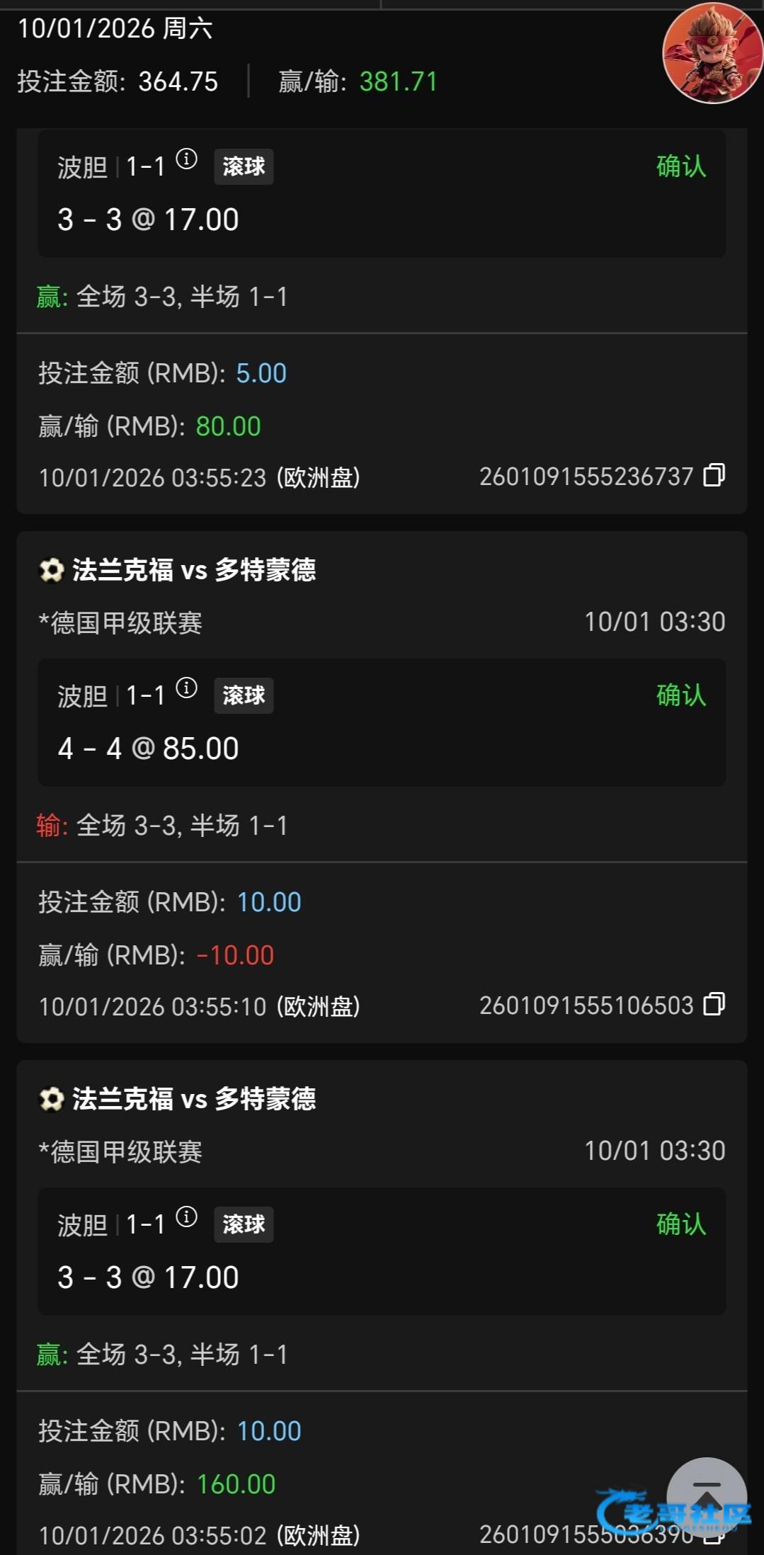 串子每次都差一场,还好多特1-1的时候买了多特3-3,多特很喜欢打平局,去年打了两场4-4